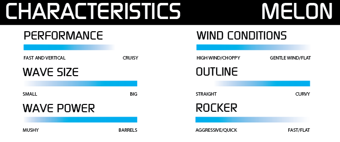 The Melon has full shoulders and a wide surface area for easy planing and a very balanced feel. The tail channels allow you to really drive with your back foot to set up for an air or to lay into a top turn without worrying about breaking your tail out of the water before you want to. This board will get you the most out of any condition you choose with one of the most technical shapes on the market.